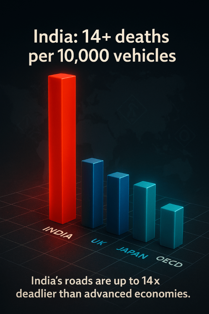 • India: 12 deaths per 100,000 population, and 14+ fatalities per 10,000 vehicles.