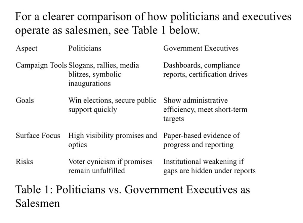 Executives mirror this dynamic in administration. Examples include sanitation drives where toilets were built faster than water systems, infrastructure inaugurations without long-term maintenance, and startup procurement policies that promise access but impose hidden barriers. These cases show how executives master the pitch, but the product lags behind.