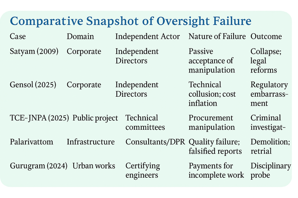 A similar pattern echoes across public infrastructure, where Independent Engineers (IEs), designed to serve as neutral arbiters between contractor and client, face parallel pressures. Their contracts are financed and renewed by the very authorities they monitor, transforming independence into dependence by design. From expressways and smart city projects to ports and bridges, the IE system mirrors the same conflict-ridden architecture that weakens corporate boards. The erosion of independence—through data opacity, financial subordination, and procedural capture—has made both directors and engineers complicit participants in the theatre of compliance rather than agents of accountability.