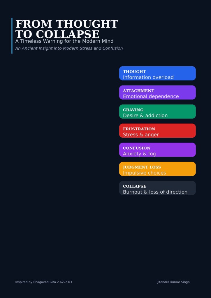 The Gita presents a cause–effect chain of human behavior that is extremely relevant to management and leadership. It explains how unmanaged attention and emotions lead to poor decisions and organizational failure.